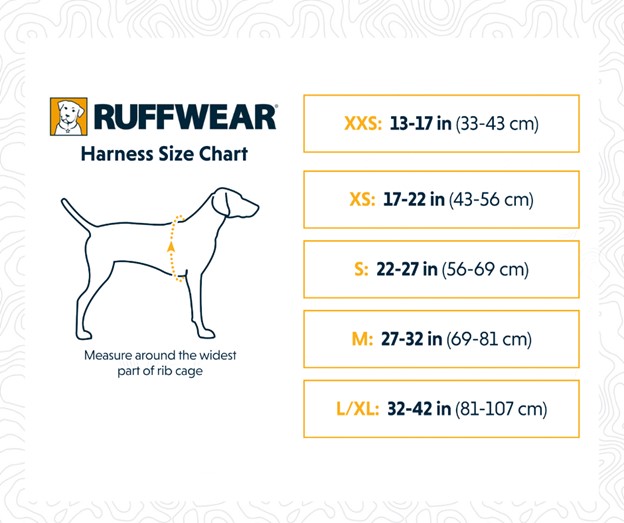 To measure your pooch, take a tape measure and measure the widest part of their girth, which is the area slightly behind their front legs. Then, find the correct size on Ruffwear’s handy guide below. If your dog is at the upper end of the size brackets, it is always better to size up rather than down.